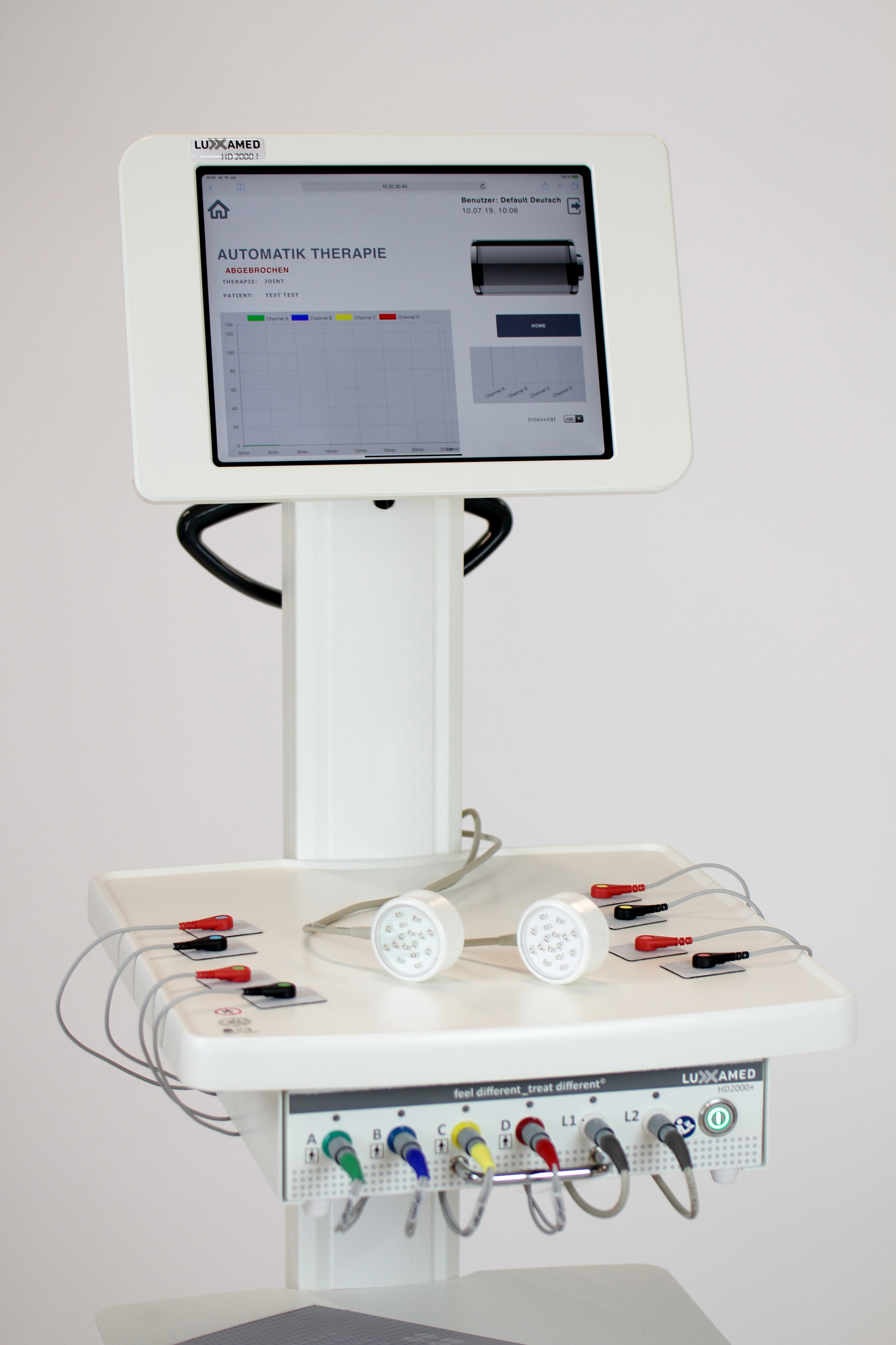 Der Luxxamed HD 2000 + misst vor jeder Behandlung zuerst den Zustand des Gewebewiderstands und erstellt mit den Informationen ein individuell auf den Patienten "maßgeschneidertes" Therapieprogramm. Sogar während der Behandlung wird immer wieder gemessen und dem jeweiligen Gewebewiderstand des Patienten neu angepasst.